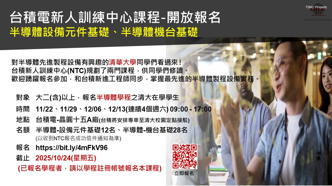 【轉知】TSMC-2025 年台積新人訓練中心(NTC)11月課程-開放大二(含)以上報名 !
