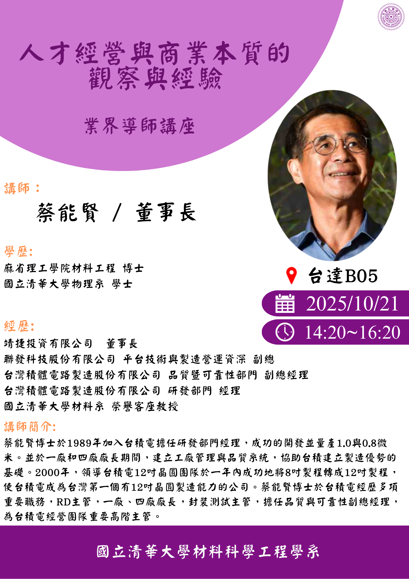 材料系演講資訊:2025/10/21 (二) 14:20~16:20 蔡能賢 (董事長) 人才經營與商業本質的觀察與經驗【地點 台達館B05】