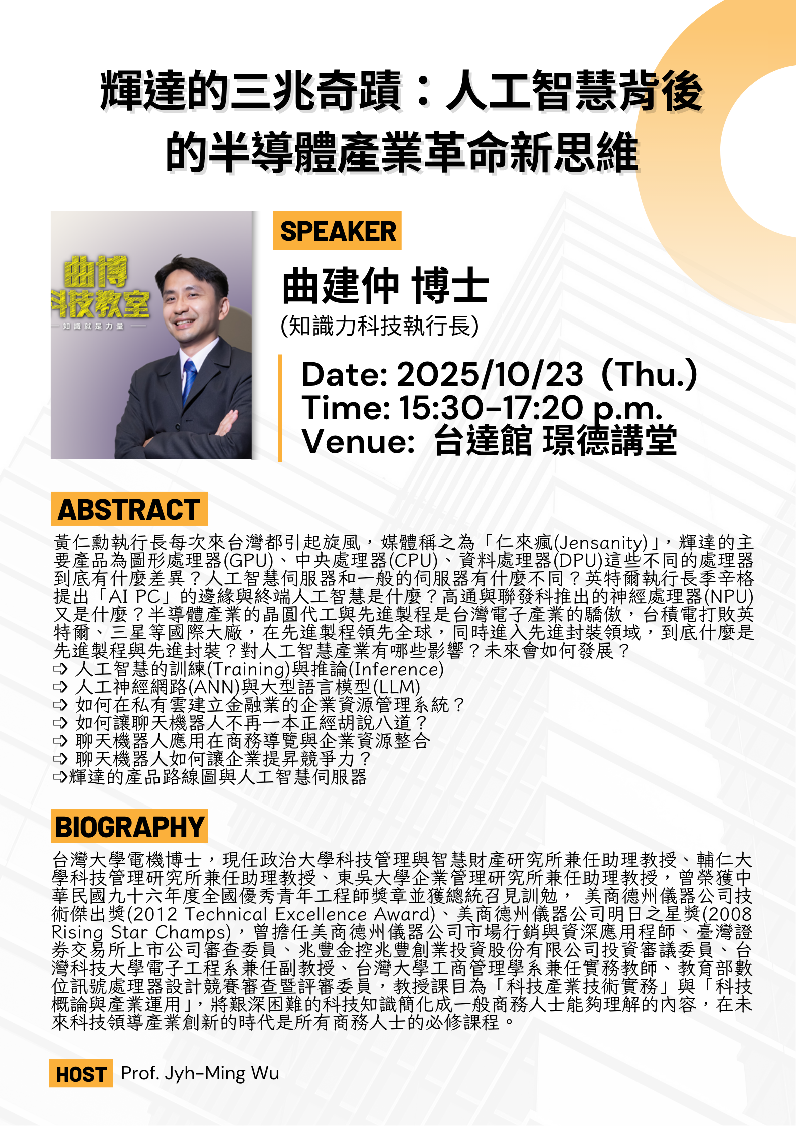 材料系演講資訊:2025/10/23 (四) 15:30~17:20 曲建仲博士 (知識力科技執行長)輝達的三兆奇蹟:人工智慧背後的半導體產業革命新思維【地點 台達館B1璟德講堂】