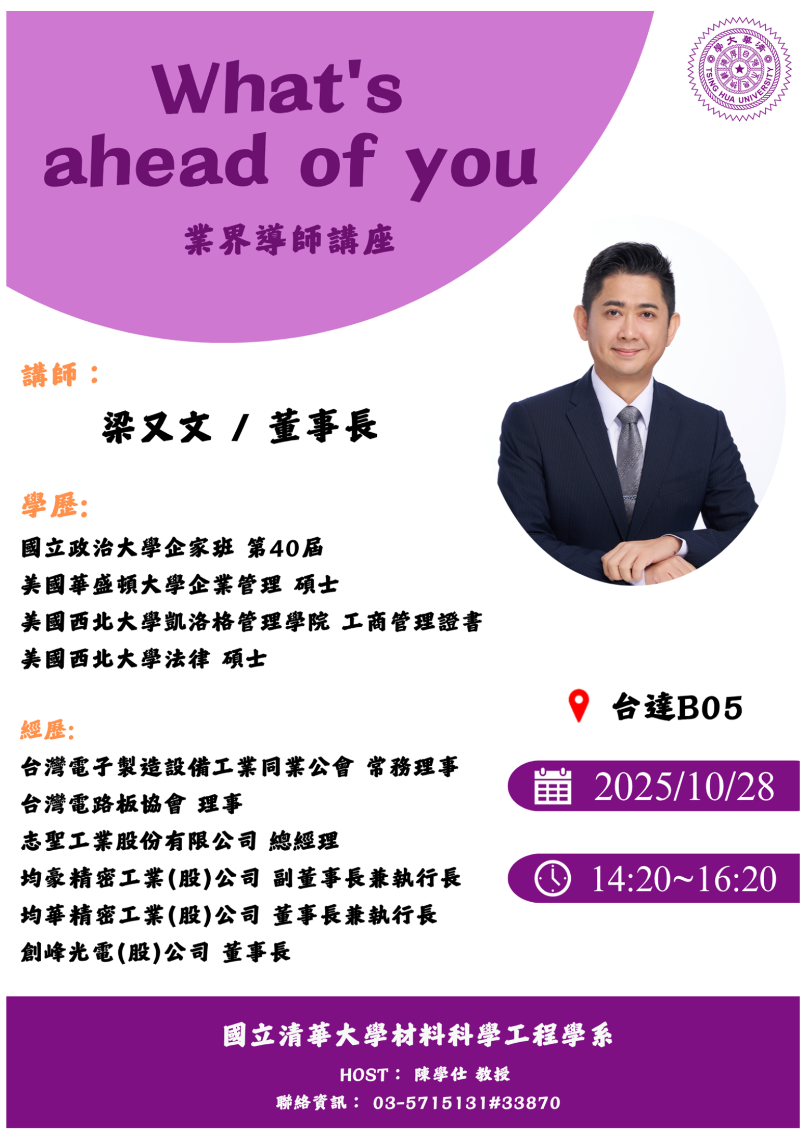 材料系演講資訊:2025/10/28 (二) 14:20~16:20 梁又文 董事長 What's ahead of you【地點 台達館B05】
