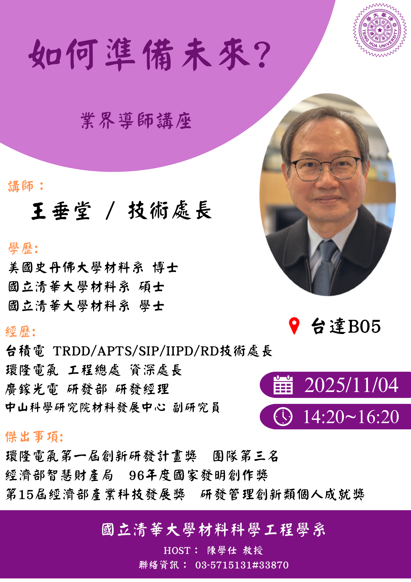 材料系演講資訊:2025/11/04 (二) 14:20~16:20 王垂堂(台積電處長) 如何準備未來【地點 台達館B05】