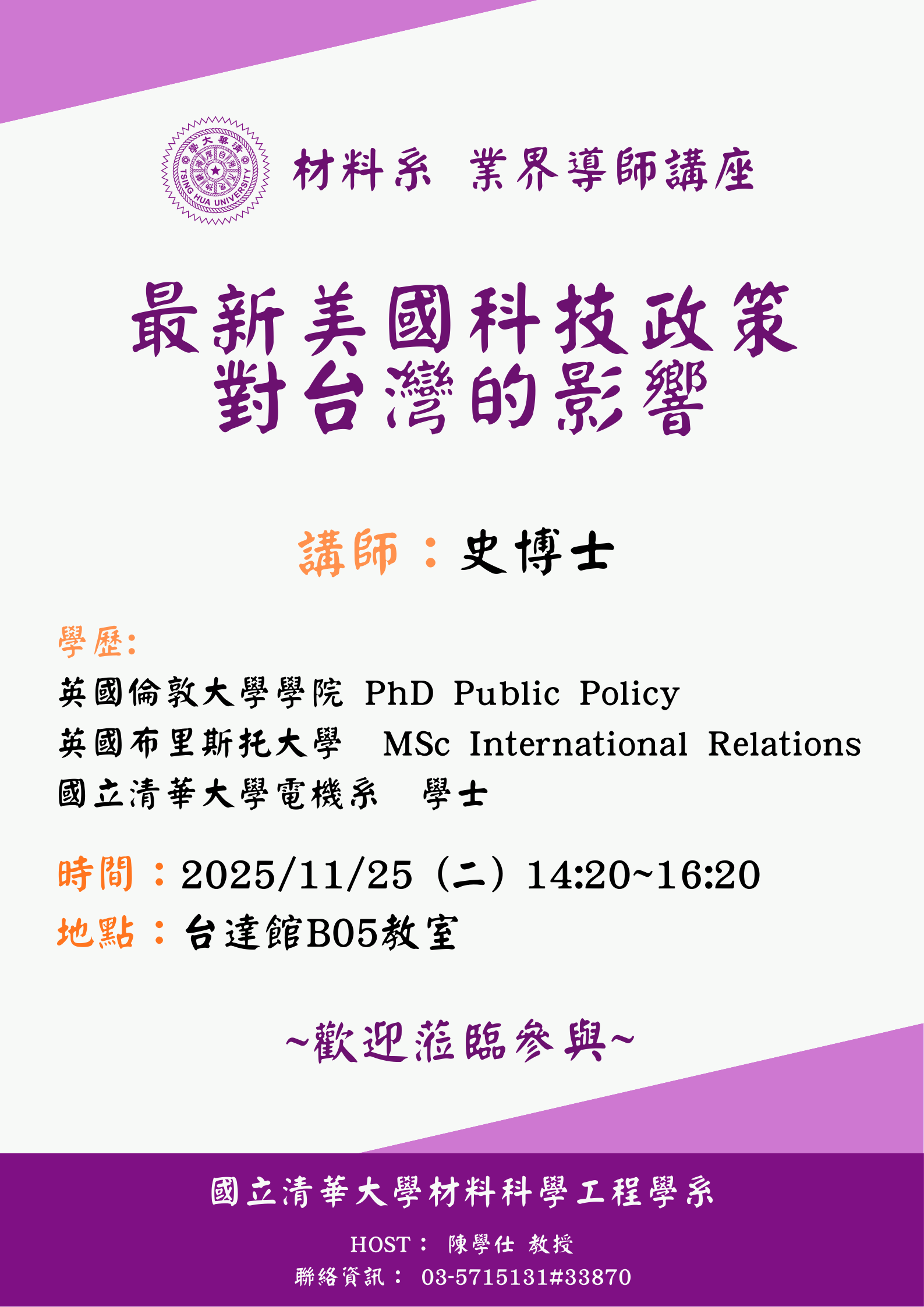 材料系演講資訊:2025/11/25 (二) 14:20~16:20 史博士 最新美國科技政策對台灣的影響【地點 台達館B05】