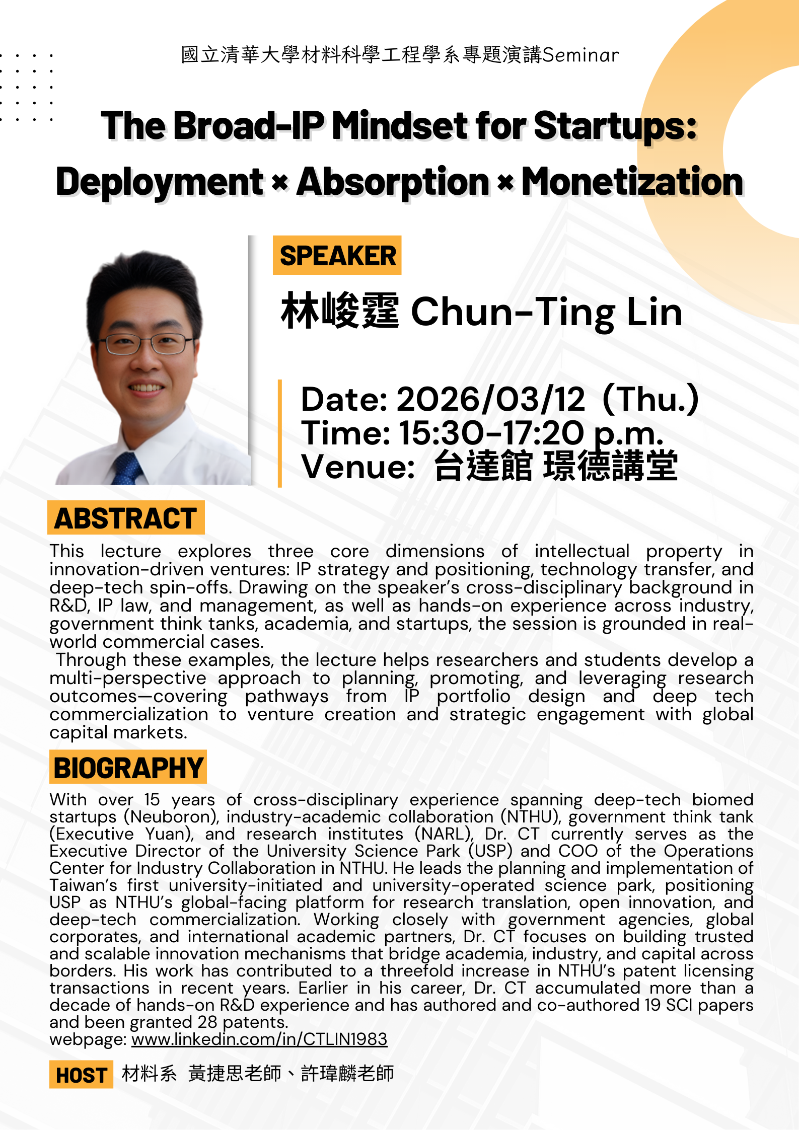 材料系演講資訊:2026/03/12 (四) 15:30~17:20 The Broad-IP Mindset for Startups: Deployment × Absorption × Monetization【地點 台達館B1 璟德講堂】