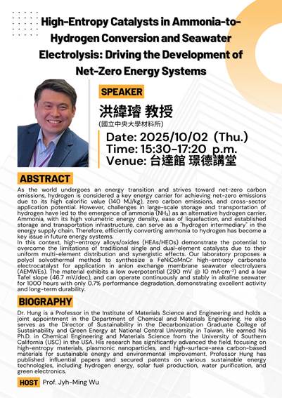 材料系演講資訊:2025 / 10 / 02 (四) 15:30~17:20 洪緯璿 教授 High-Entropy Catalysts in Ammonia-to-Hydrogen Conversion and Seawater Electrolysis: Driving the Development of Net-Zero Energy Systems【地點 台達館B1璟德講堂】