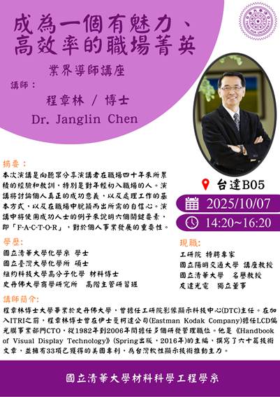 材料系演講資訊:2025/10/07 (二) 14:20~16:20 程章林 (友達獨立董事) 成為一個有魅力、高效率的職場菁英【地點 台達館B05】