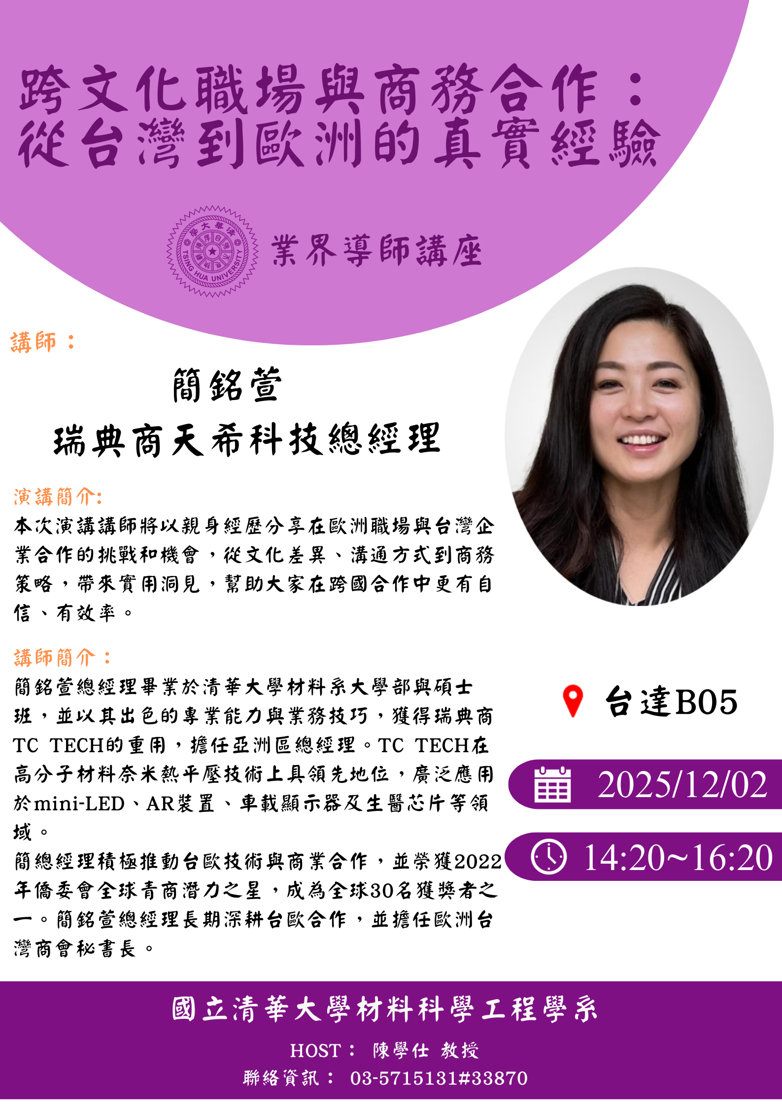 材料系演講資訊:2025/12/02 (二) 14:20~16:20 簡銘萱總經理 跨文化職場與商務合作:從台灣到歐洲的真實經驗【地點 台達館B05】