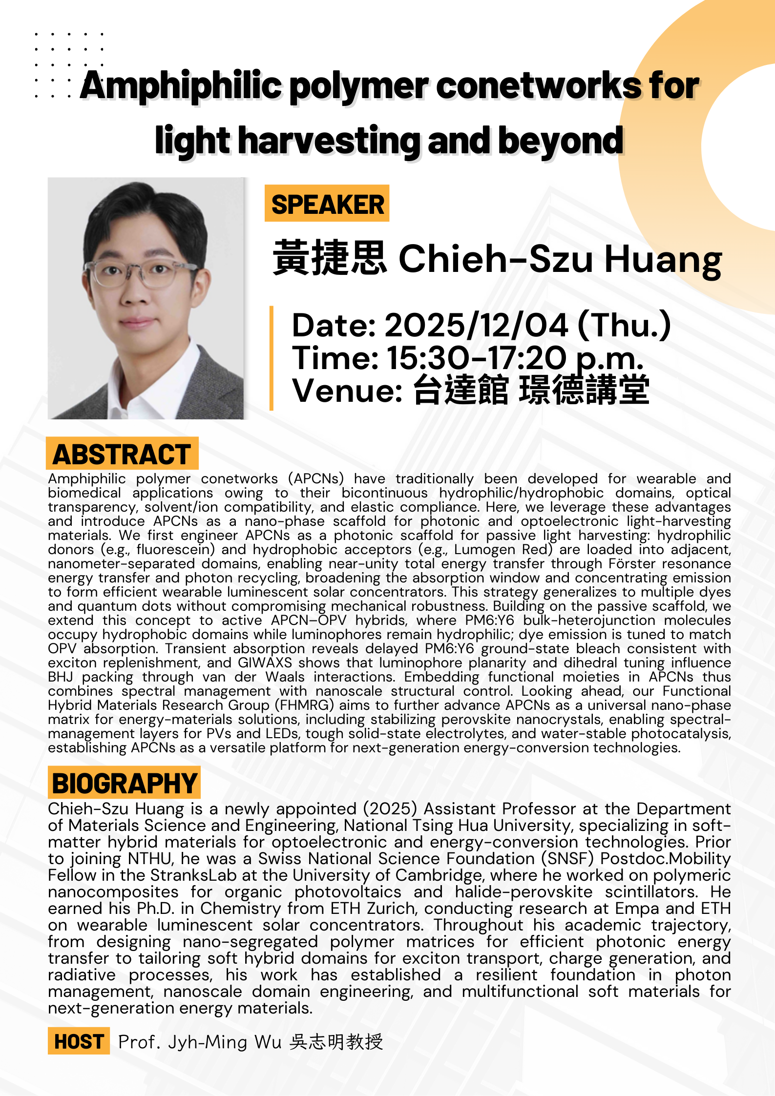 材料系演講資訊:2025/12/4 (四) 15:30~17:20 黃捷思 Amphiphilic polymer conetworks for light harvesting and beyond【地點 台達館B1 璟德講堂】
